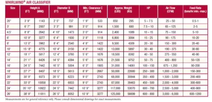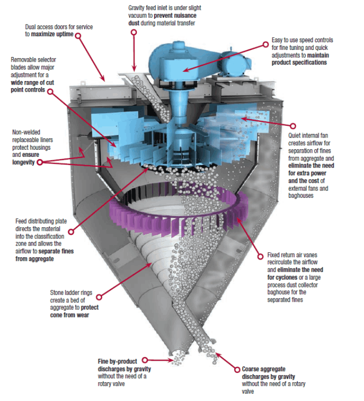 The Sturtevant Whirlwind® Air Classifier is specifically designed to effectively remove fines from aggregates without screening or wet washing. The Whirlwind® will increase yourproduction capacity while maintaining quality standards, reduce maintenance time and improve plant uptime.The Whirlwind® Air Classifier is engineered for the rigors of aggregate separation and provides our customers with a quality-built product with the long equipment life they demand. The Whirlwind® Air Classifier has capacities up to 1200-tons per hour and offers an exceptional ability to achieve a wide range of separations.